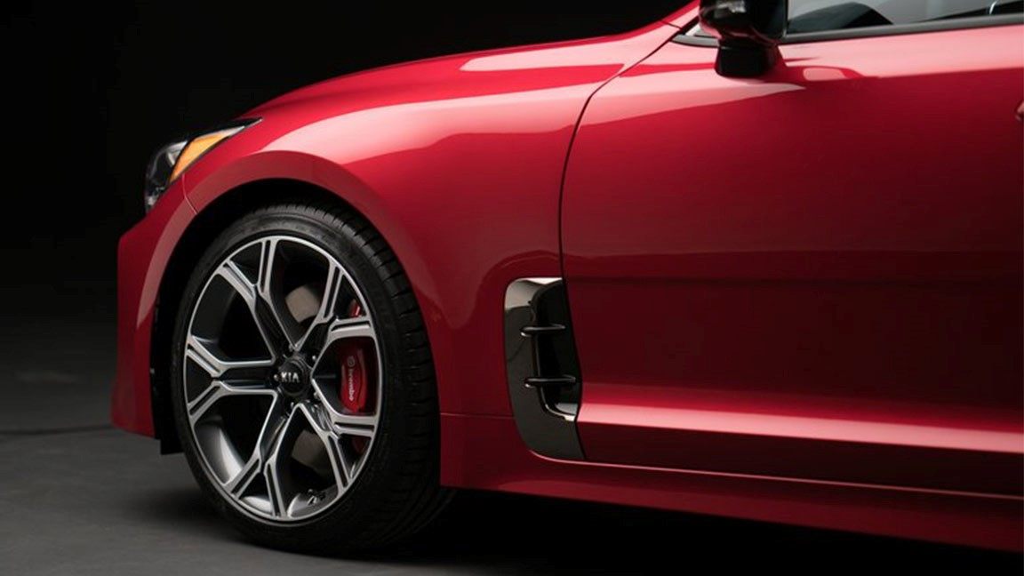 斯汀格的颜值非常高,符合起亚品牌一贯的设计水准,车头拥有家族样式的中网,下方保险杠造型突出,其中两侧进气口并非装饰件,它可以引导一部分气流通过从而为刹车盘降温。