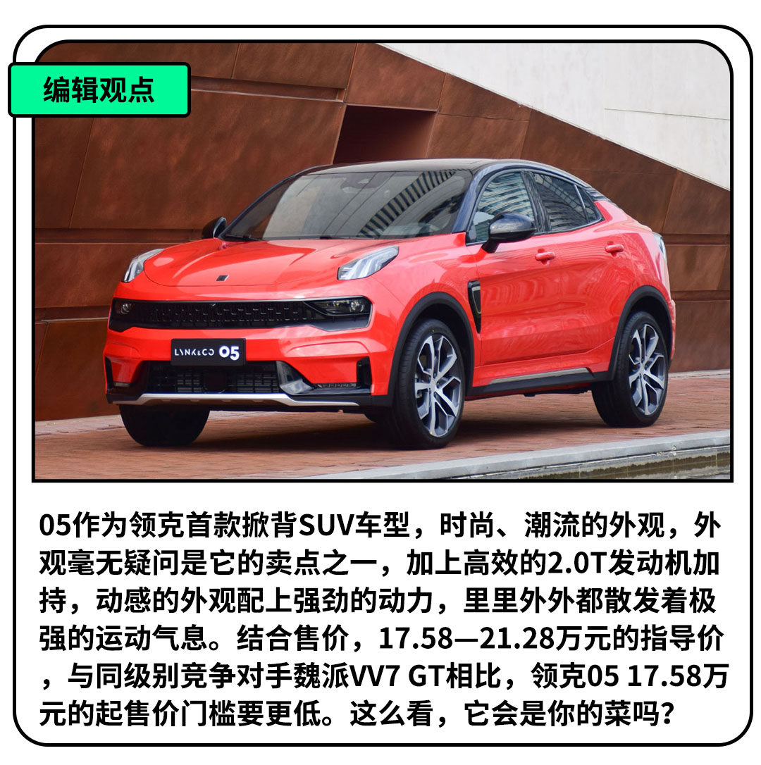 继之前的时间限量版车型推出后,在5月5日晚,领克05正式将车型配置补全,共推出5款车型,全部均搭载了高效的2.0T发动机,但其中又有两驱与四驱之分,价格区间为17.58—21.28万元。