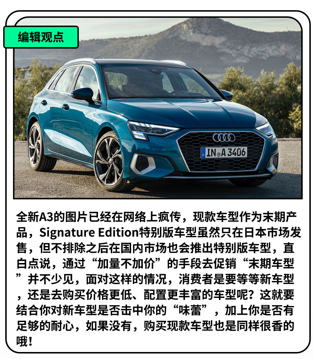 今日,奥迪官方发布了一组A3 Signature Edition特别版的官图,特别版车型针对配置做出了一系列的提升,其中包括LED大灯组、自动空调、停车辅助系统、倒车影像、无线充电以及18英寸轮毂等等。遗憾的是,目前Signature Edition特别版仅针对日本市场推出。