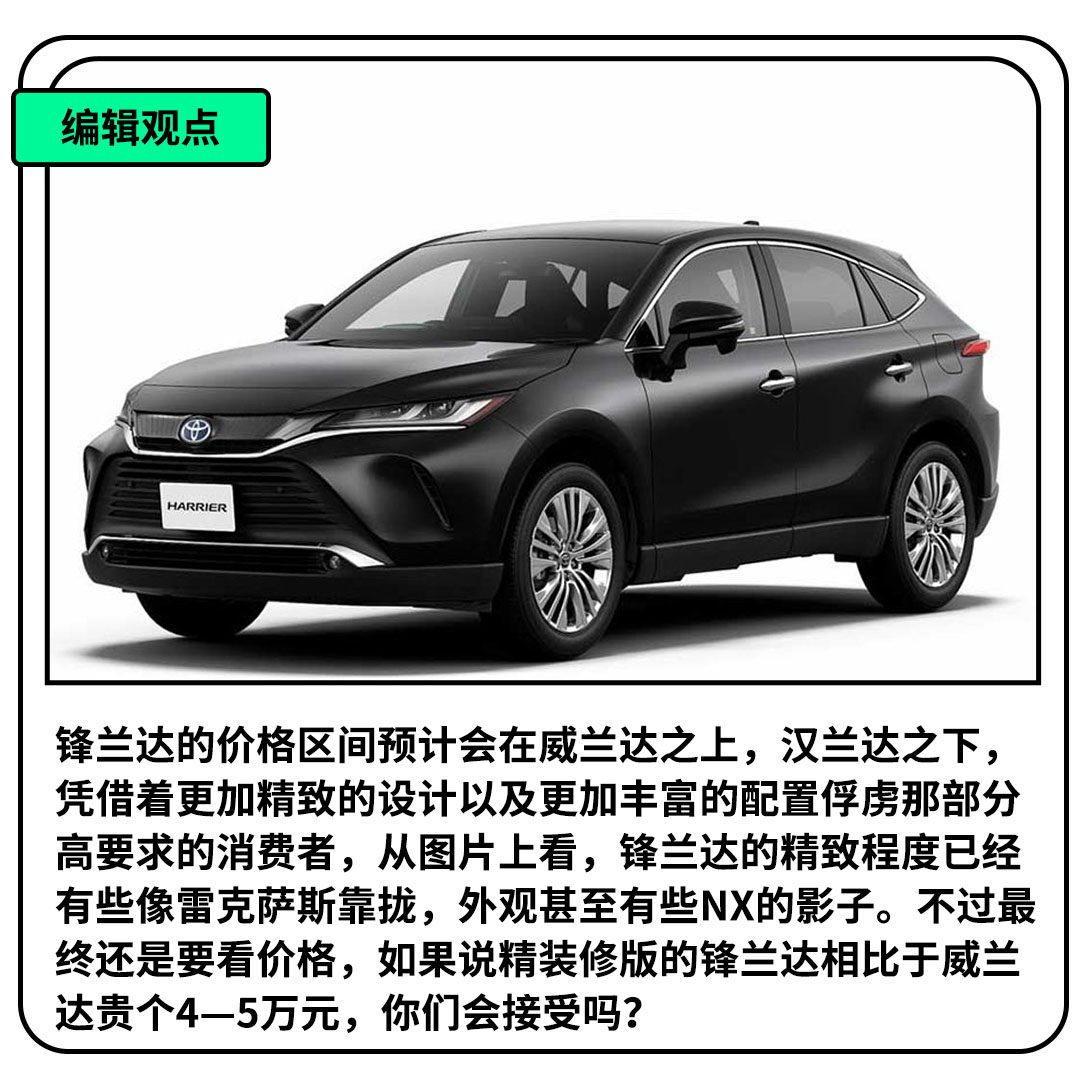 Harrier其实是基于RAV4同一平台打造,但相比于RAV4,Harrier无论是外观设计还是内饰用料都要相加的精致,像全LED大灯、JBL音响系统、可调光式全景天窗以及流媒体后视镜等一系列高配置,我们都能在Harrier上看见。