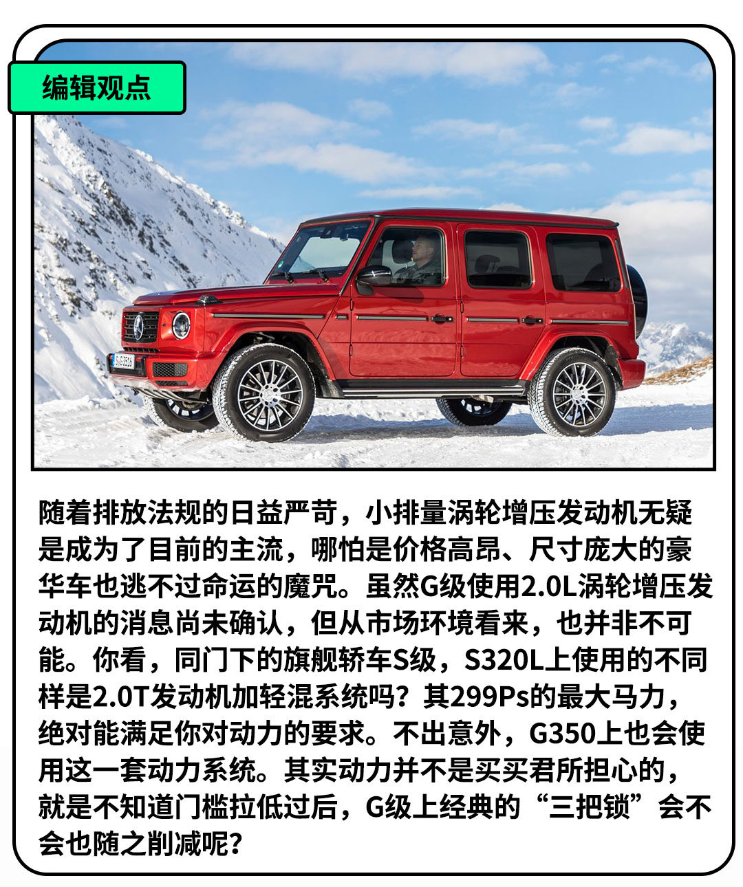 据网上消息称,由奔驰生产的底盘代号为W463.210的G350车型,将搭载2.0L涡轮增压4缸发动机,这或许会成为主供中国市场的G350车型。不过,目前这一消息官方尚未作出确认。