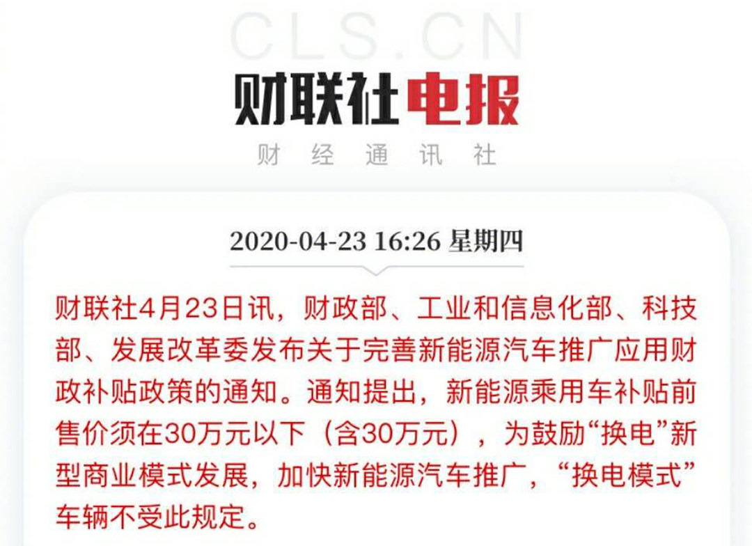 根据2020年补贴新政,新能源车补贴政策实施期限延长至2022年底,但售价30万元以上、续航低于300km的新能源车将不享受补贴;值得注意的是,为加快新能源车推广,鼓励“换电”新型商业模式发展,采用“换电模式”的车辆不受此规定限制。