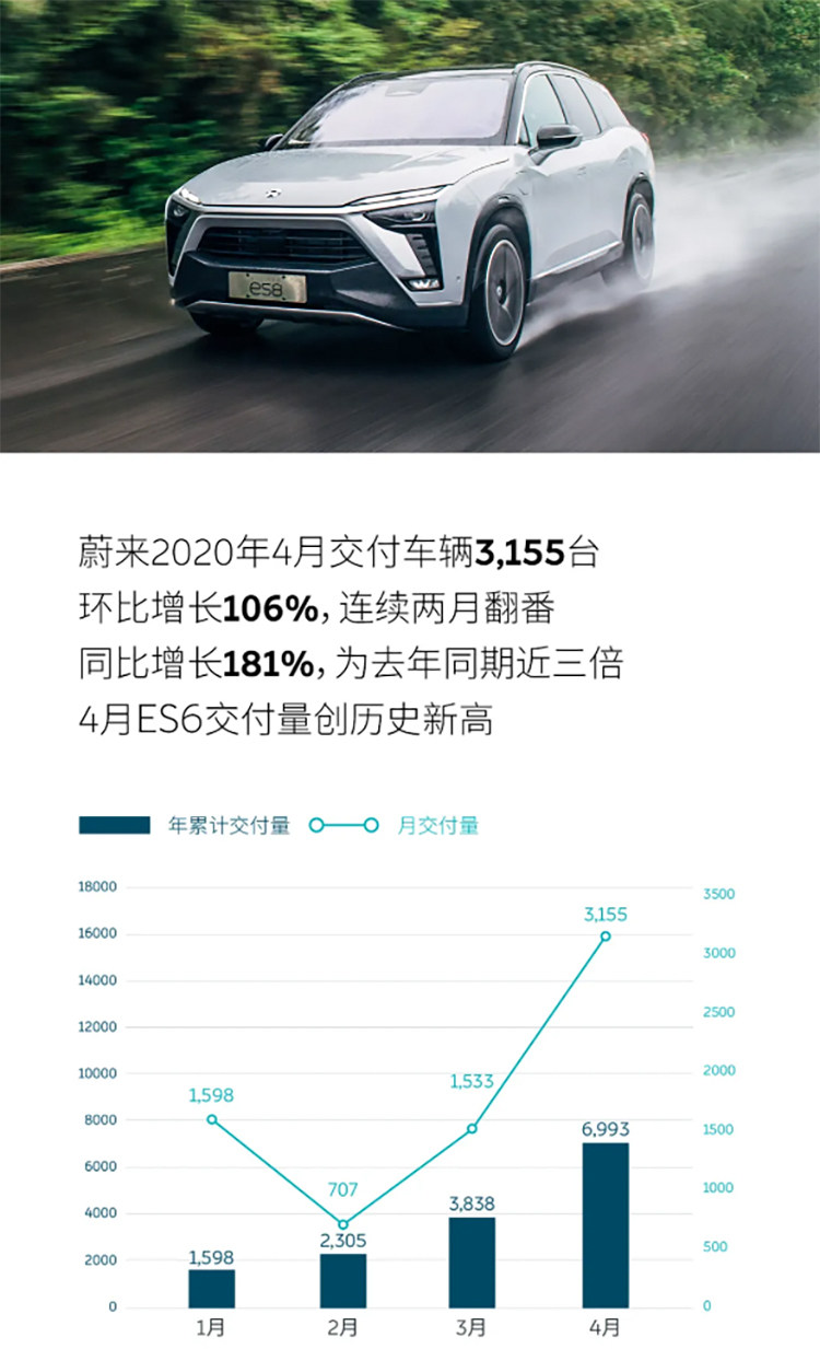 远不止此,今年4月份,蔚来交付了3155辆,同比增长181%,环比上涨106%,连续两个月环比翻番。目前为止,今年累计已交付6993辆,成绩在造车新企里独占鳌头。