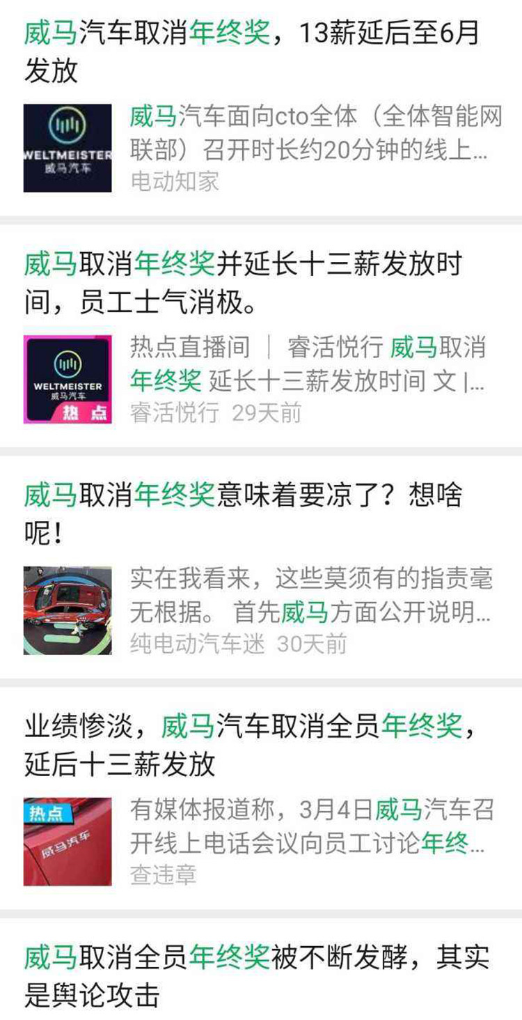 不过,福兮祸之所伏。今年3月5日,有媒体报道称:威马取消发放全体员工年终绩效奖金,一时间网上也是议论纷纷。但很快威马汽车就作出回复表示:因为未能如期完成公司2019年目标,所以取消发放全体员工年终奖,同时将员工“十三薪”和“员工购车补贴”等福利顺延至6月后再如数发放。