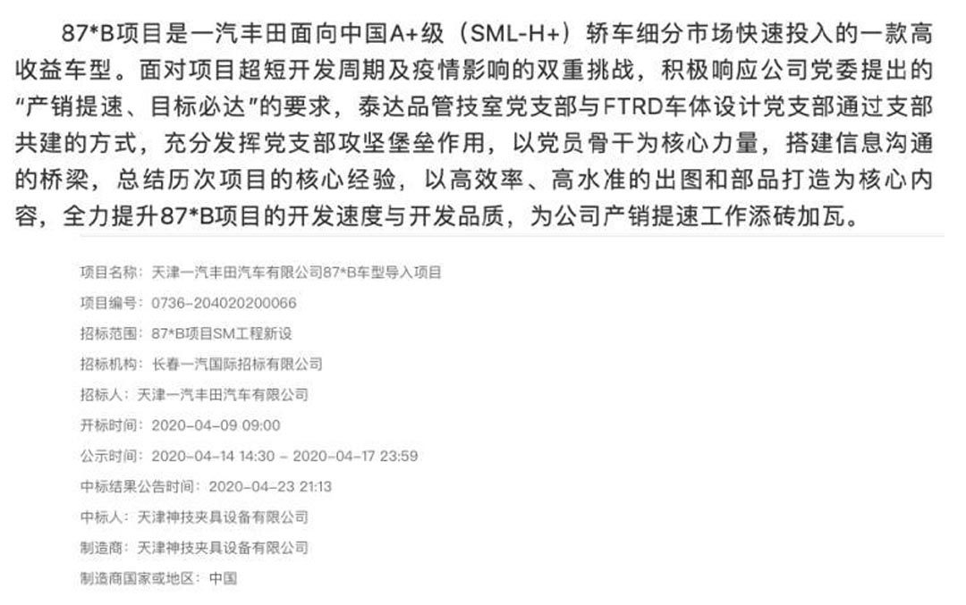 目前我们从一汽丰田的一份招标信息获悉,公司目前正在逐步推进87*B车型项目。从招标信息来看,新车定位高于卡罗拉,低于凯美瑞,推出后将填补丰田A+轿车的空缺。
