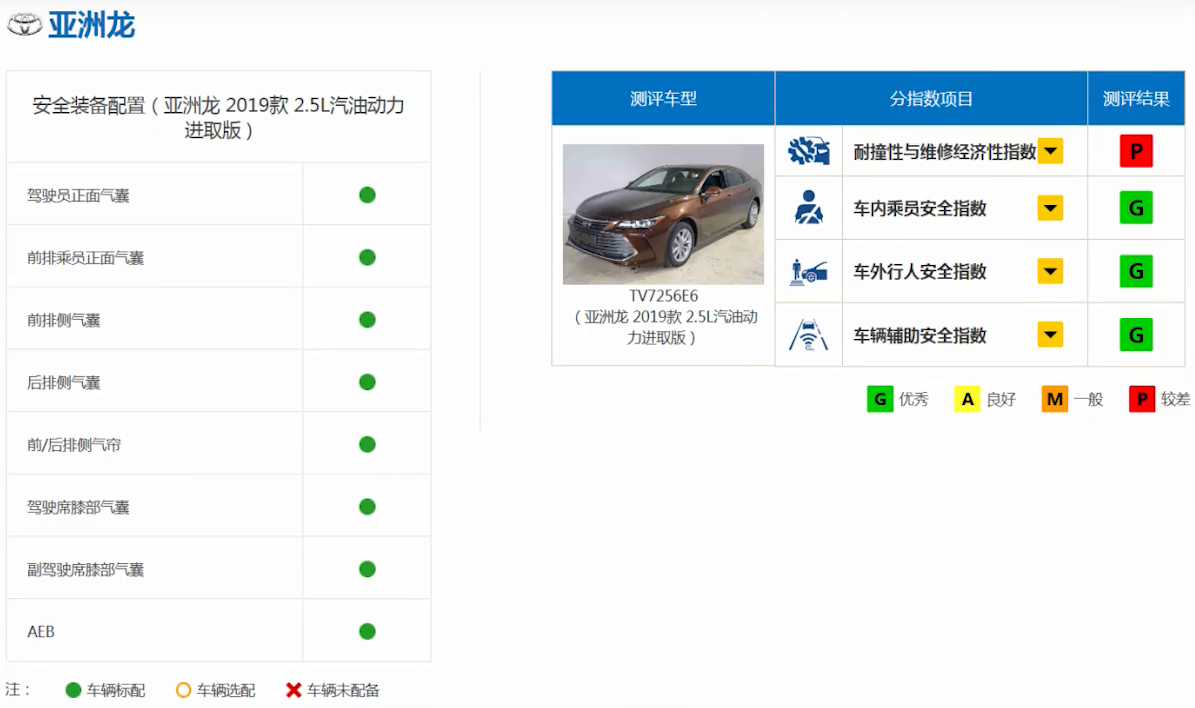 除了有着已经达到C级车的尺寸以外,肩负着丰田旗舰车型的亚洲龙在配置上同样不可小觑。其全系标配了丰田规避碰撞辅助系统(TSS),全车10气囊,在中保研测试中车内乘员、车外行人、车辆辅助安全指数方面都拿到了G(优秀)的成绩。