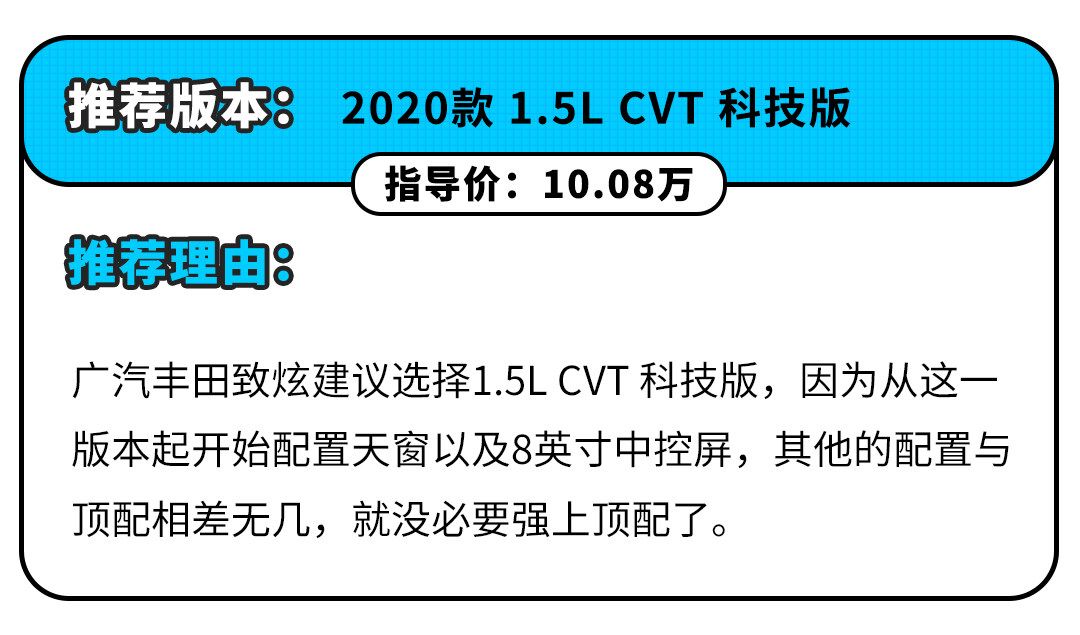 买买君推荐的版本为1.5L CVT科技版,主要是因为与顶配版相比,主要的车内配置是一样的,仅仅为了无钥匙启动和多功能方向盘而多加3000元钱,买买君认为必要性不大。