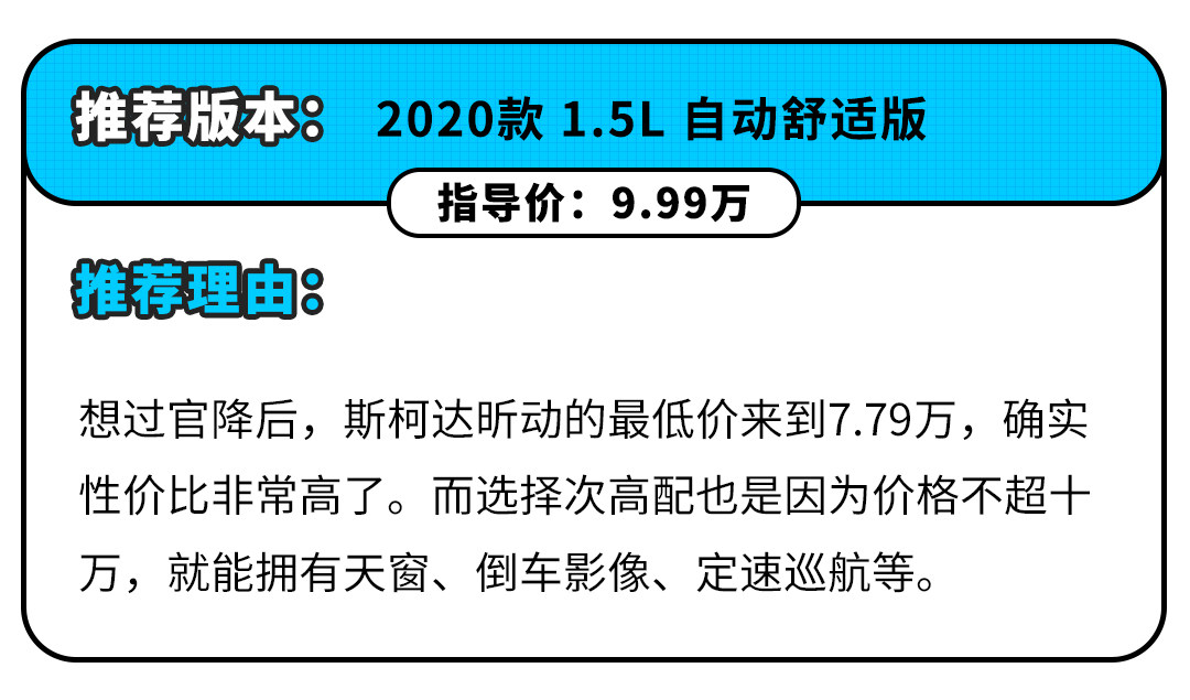 买买君推荐入手这台次高配的 1.5L自动舒适版,主要在于几个重要的配置如中控屏、电动天窗、倒车影像、定速巡航等都是在自动舒适版上才开始配置的。而且自动舒适版价格也控制在10万元以内,与顶配相比少的一些不重要配置,买买君觉得并不值得多加一万块。