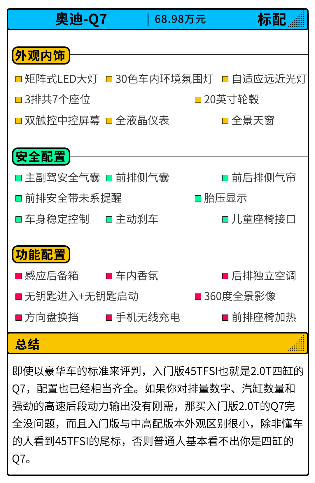 总之,中改Q7相比老款外观设计更年轻、内饰更简洁豪华、动力总成更加强劲和高效,加上相比同级别对手有着更强的主观霸气感,因此以68.98-86.68万的指导价看,只要你不自主选配,那这个价格就算不优惠也已经相当合适,土豪朋友们,出手吧!