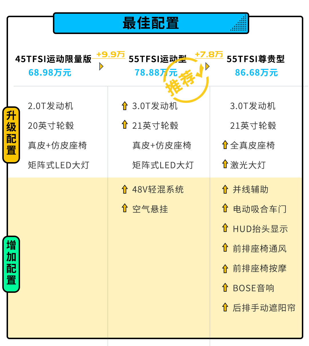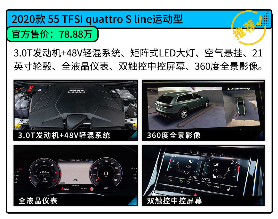 因此预算足够的话,我强烈推荐你购买搭载3.0T V6引擎的55TFSI运动型,比入门版多花9.9万,就能得到本次改款最关键的3.0T引擎和48V轻混系统,而且配备了可调节高度和软硬的空气悬挂,舒适感和越野通过性又上一个台阶,多花的这些钱不冤。
