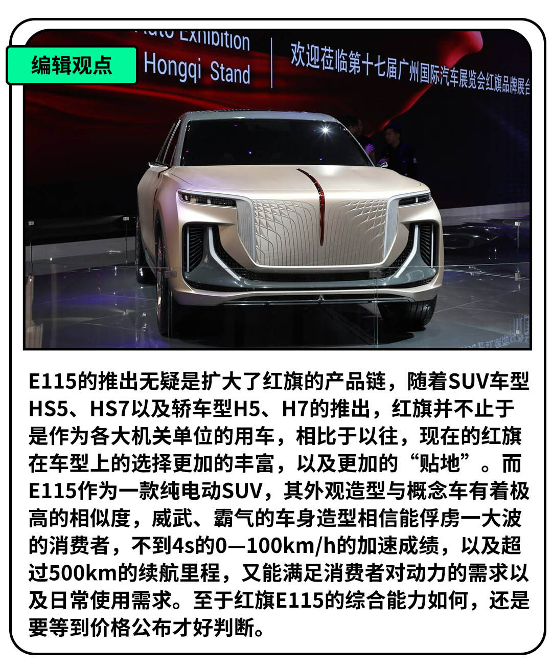 在前不久,红旗E115低伪装路试碟图曝光,大致来看,新车型延续了概念车版造型设计。在动力系统上,红旗E115作为纯电动车,虽然目前官方尚未公布其动力信息,但据网上消息来看,新车型0—100km/h加速时间在4s内,续航里程在500km以上。
