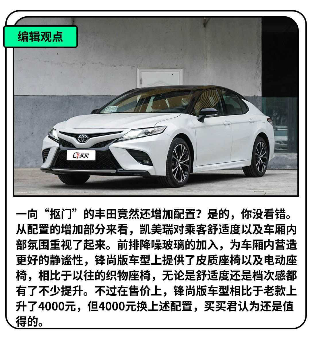 近日,新款凯美瑞正式上市,新车型主要针对配置做出一定的提升。具体为:豪华版与锋尚版配备了前排降噪车窗玻璃,2.0S锋尚版配备了真皮/合成皮座椅材质、驾驶位10向电动调节,另外,部分车型还增加了红色和棕色内饰配色。