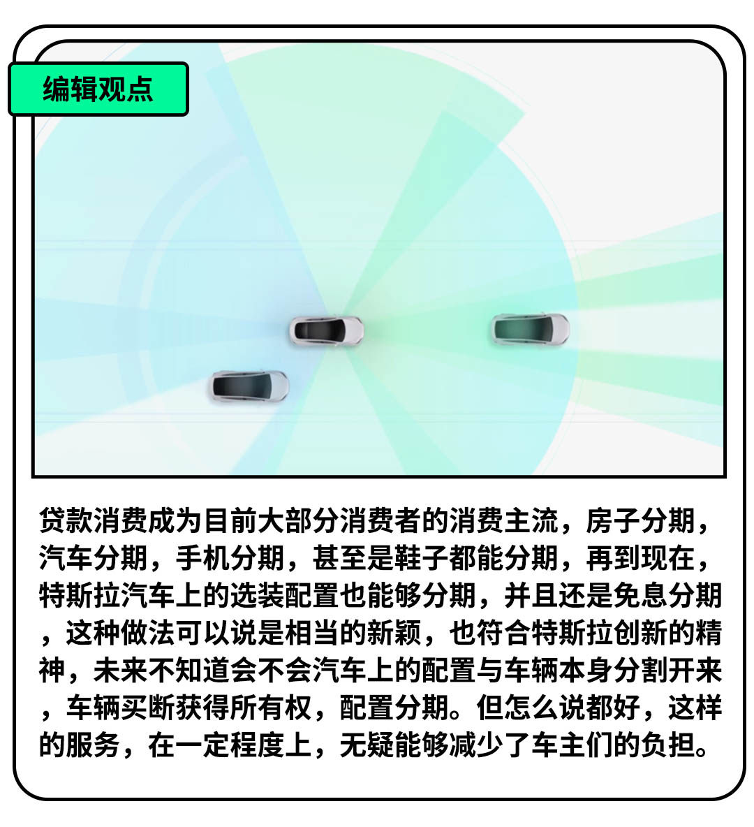 特斯拉针对已经购车的车主推出了一项三年免息分期购买完全自动驾驶选装包的活动,特斯拉完全自动驾驶选装包的官方定价为5.6万元,通过三年免息分期后,每月只需要支付1556元即可拥有,需要注意的是,该活动并不是永久进行,活动时间截止为5月31号结束。