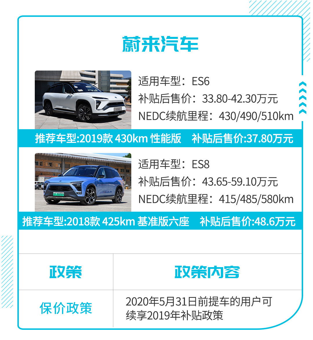因为在2020年,蔚来虽然能得到国家财政补贴,但金额有所降低,所以在过渡期(2020年4月23日至2020年7月22日),蔚来已经开始推行2020年补贴额度,这点对于现下有意入手蔚来车型的用户而言或许不太友好。但针对5月这一月份,蔚来还是推出了保价措施,凡是在5月31日前提车的用户仍可享受2019年补贴额度。