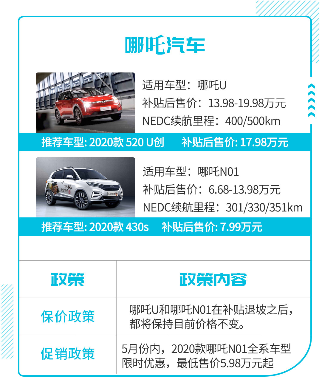 另一方面,考虑到疫情渐缓,汽车消费可能在短期内出现“报复性消费”,所以在今年5月份,哪吒汽车推出了一项针对哪吒N01全系车型的限时购车优惠福利,根据这一福利政策,新车最高优惠幅度可以达到7000元,其售价低至5.98万元。