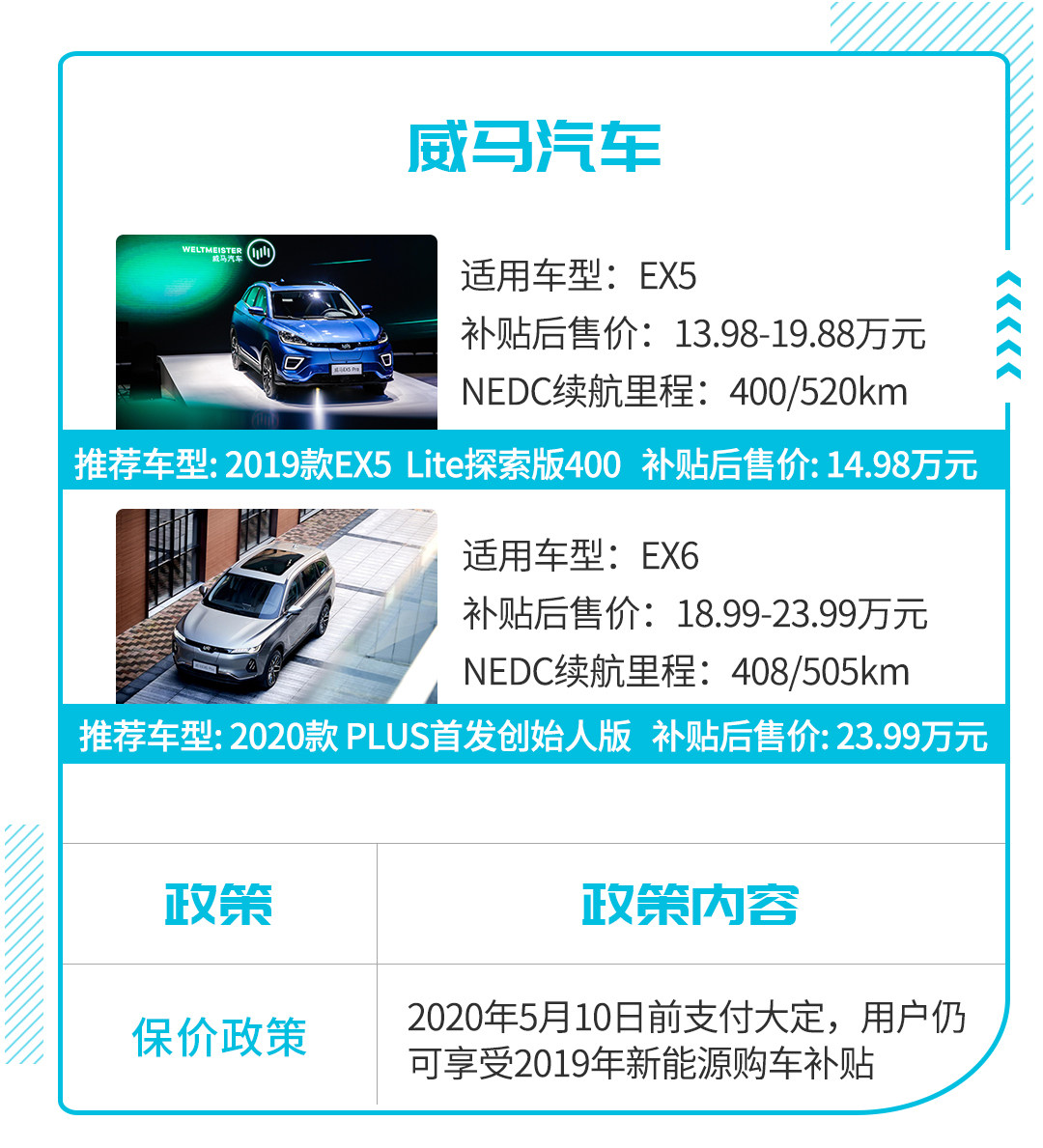 作为和蔚来处于同一阶梯的造车新势力企业,威马拥有更低的价格,也拥有更加广泛的受众群体。根据威马针对2020年新政推行过渡期推出的保价措施,用户只要在2020年5月10日前完成支付大定就可享受2019年新能源购车补贴。另一厢,目前威马旗下首款车型威马EX5已上线家家购车,用户在家家购车内购买9.9元券即可享受1000+200元的现金补贴,赤果果的“薅羊毛”。