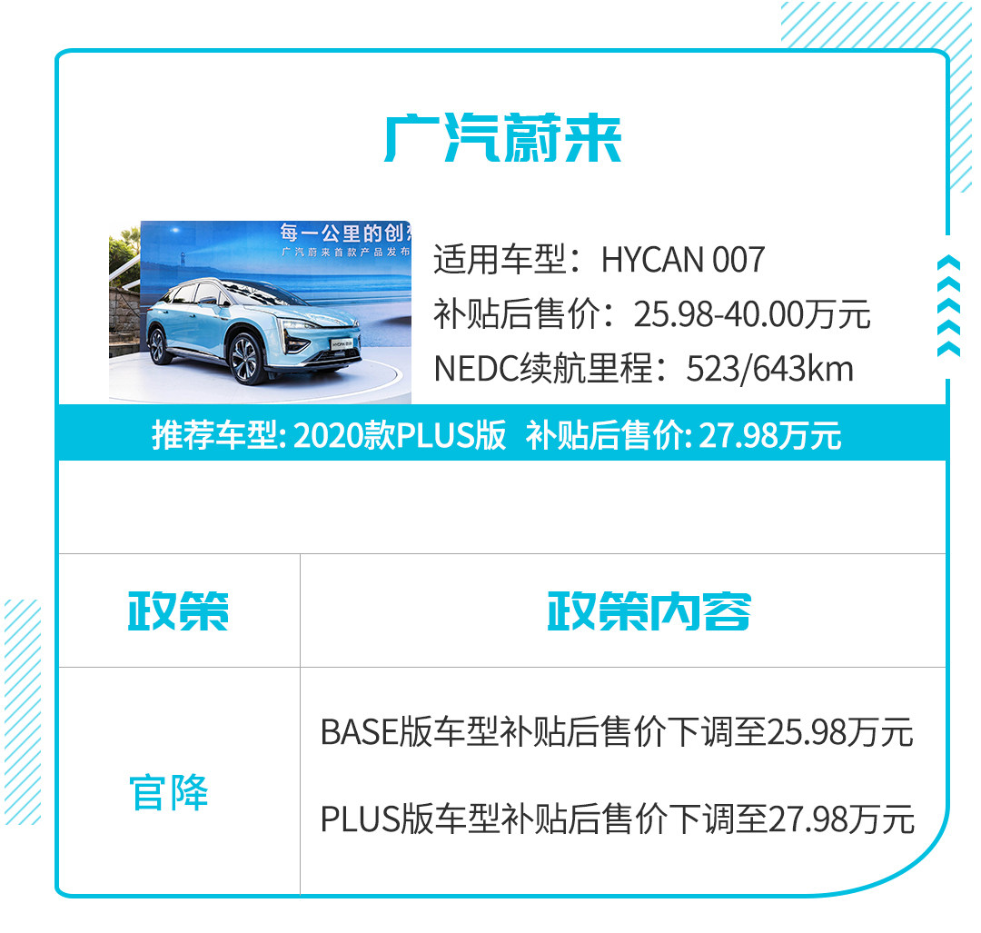 值得注意的是,新政策正式实施之前给出了三个月的过渡期,时间从2020年4月23日至2020年7月22日。考虑到这次新政提高了新能源车补贴门槛,所以不少新能源车企都针对自家产品推出了保价措施,部分车企甚至给出了一定购车优惠。都有谁呢?