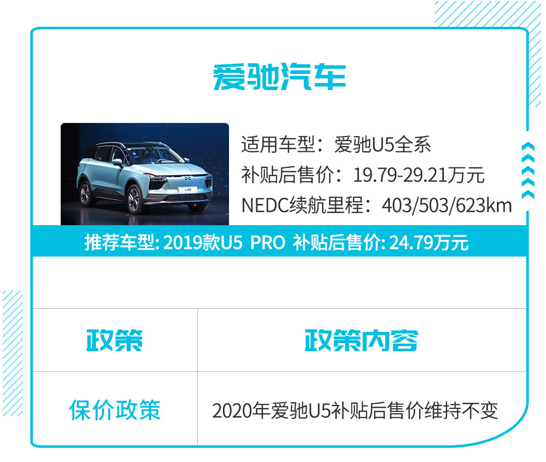 爱驰是继蔚来、威马等造车新势力企业之后,另一家推出针对2020年补贴新政(包含过渡期)购车保价措施的新能源车企。根据爱驰的保价措施,爱驰旗下首款正式进入交付阶段的车型爱驰U5 2020年的补贴后售价将维持原样,不予以变化。