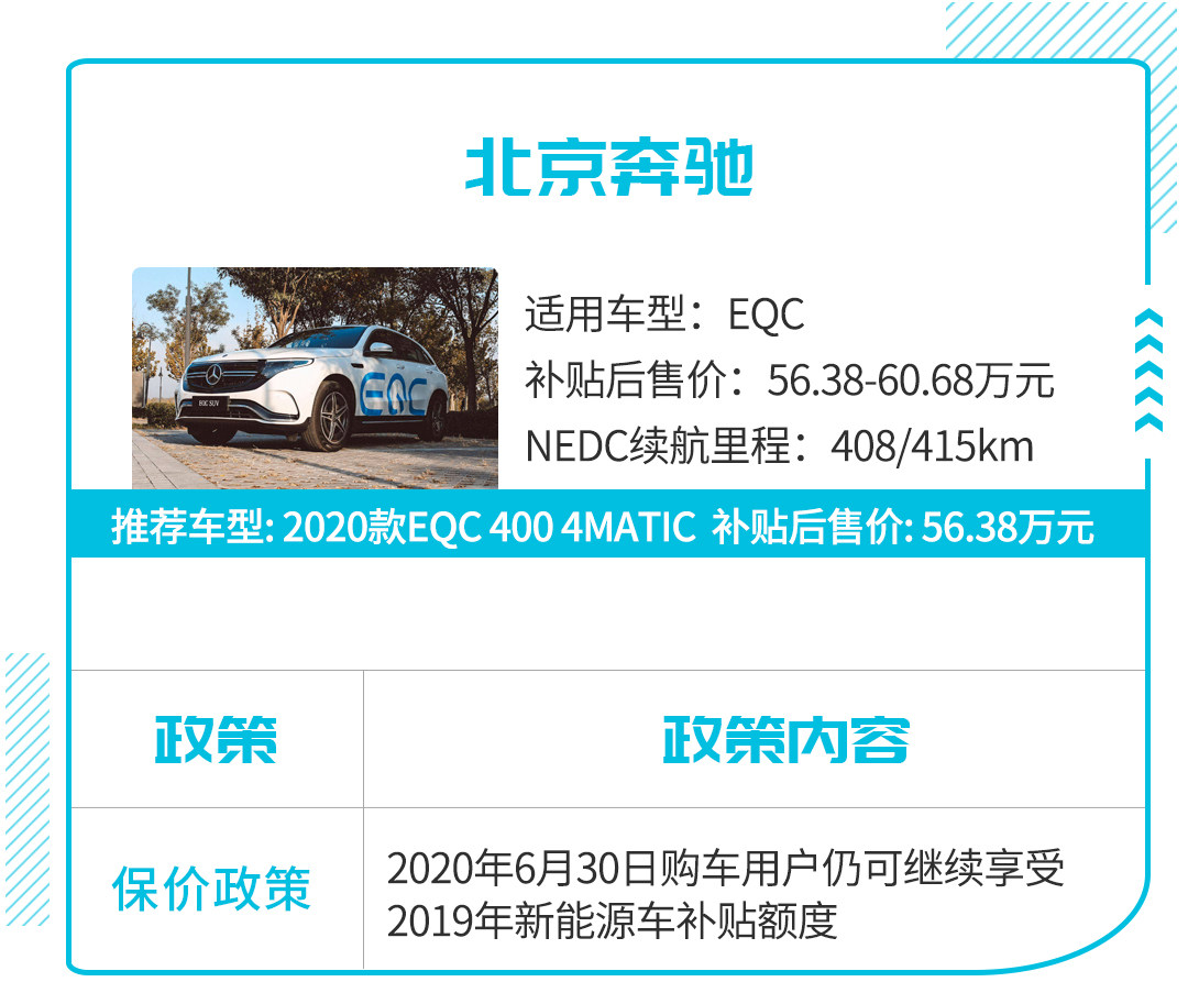 奔驰,作为豪华三巨头之一,是最迟进驻新能源市场的品牌,旗下首款产品奔驰EQC直到去年11月份才正式上市,而且上市后因为受众小,价格高昂,销量表现一直不甚理想。不过,针对2020年新能源补贴过渡期,奔驰还是推出了保价措施。奔驰官方表示,自5月8日起,在2020年6月30日前购车用户仍可享受2019年补贴额度。