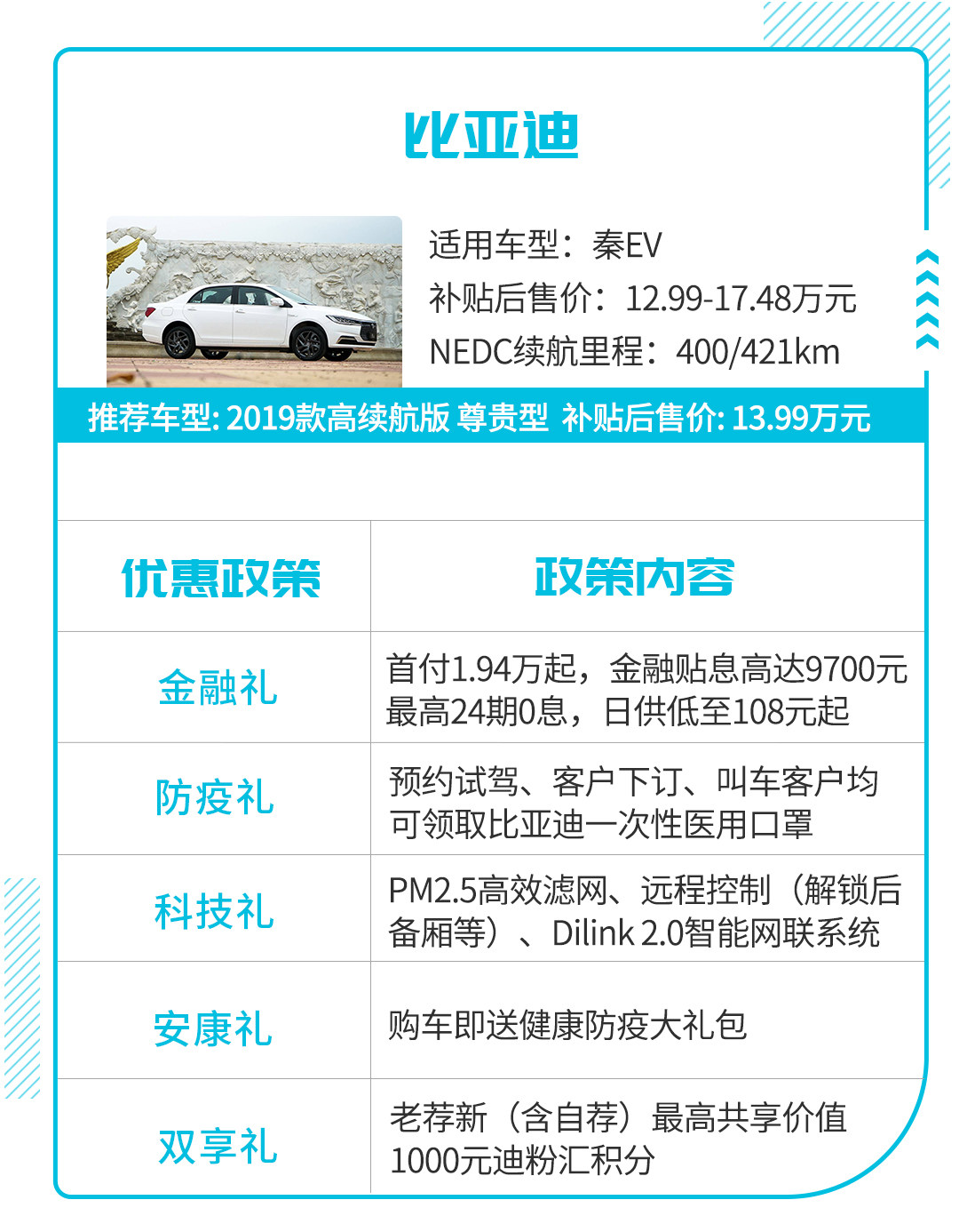 值得一提的是,为进一步刺激消费,比亚迪在保价基础上还推出了一系列的购车优惠福利政策,比如在今年5月份针对多款新能源车型推出的5项购车福利,只要用户在5月1日至5月31日内购买比亚迪新能源车,即可享受金融、防疫、安康、科技、置换礼等购车福利。