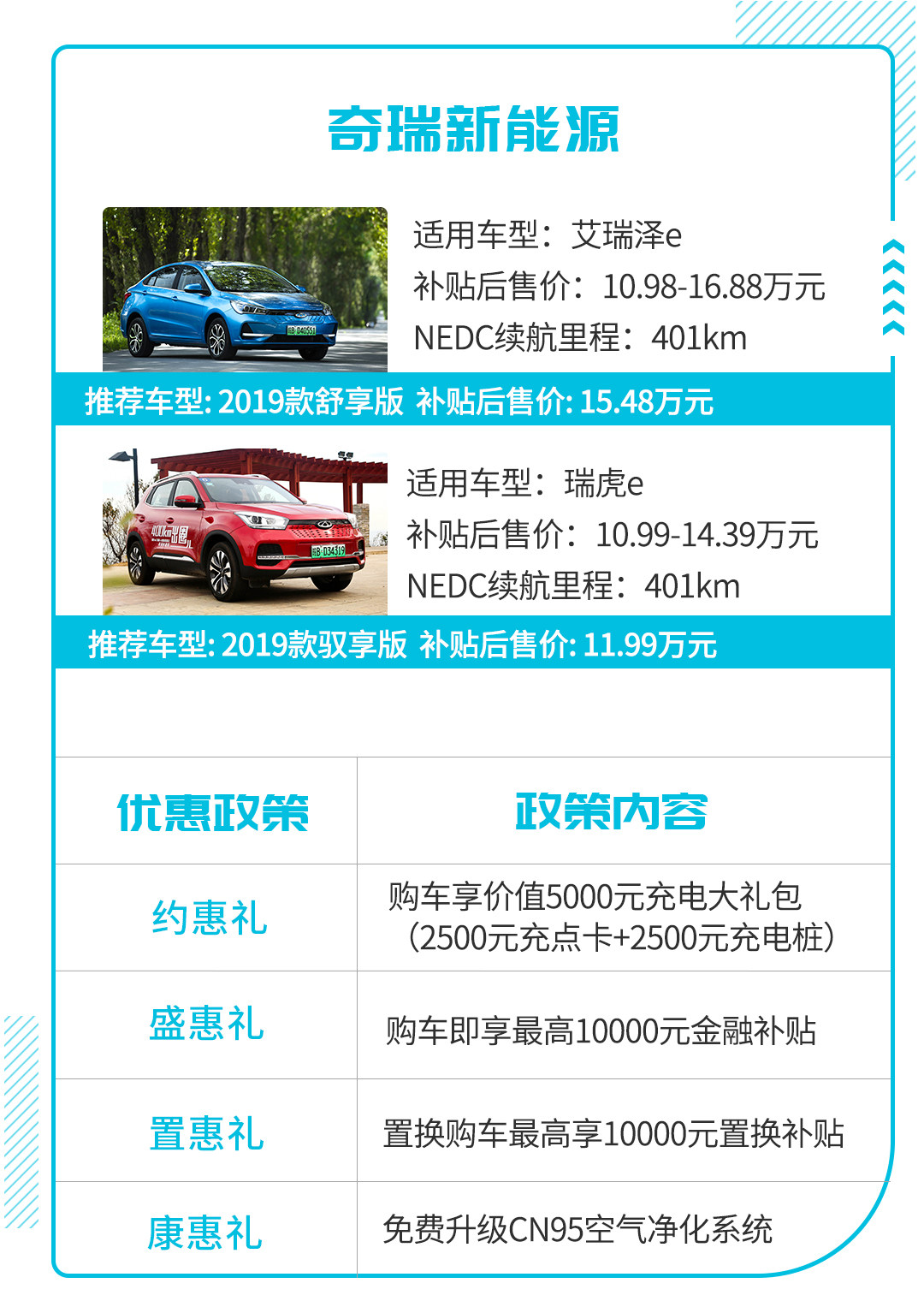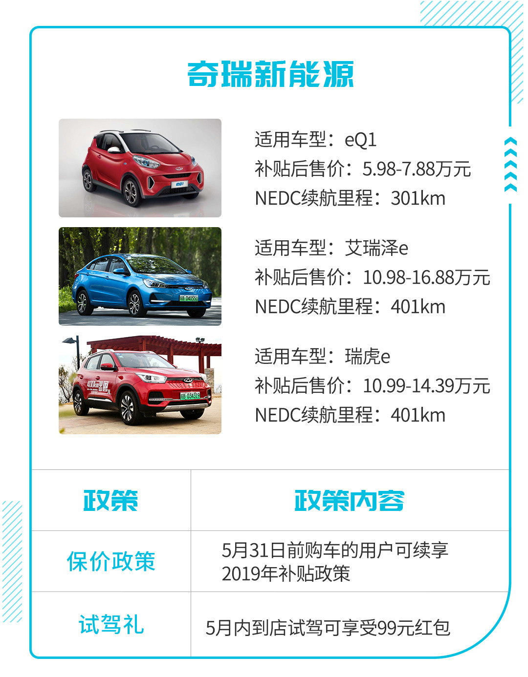 根据保价举措,消费者在5月31日前入手这三款车型的任何一款,都可以继续享受2019年新能源购车补贴。其次,奇瑞新能源和比亚迪一样,也推出了一系列的促销政策,比如购车送充电大礼包、10000元金融补贴等福利。