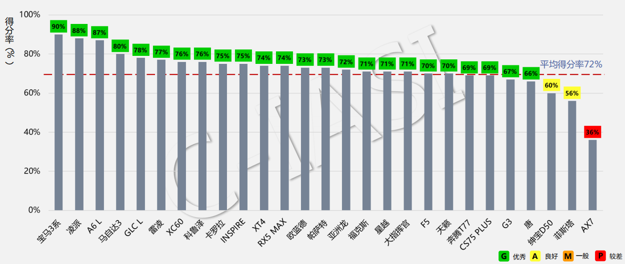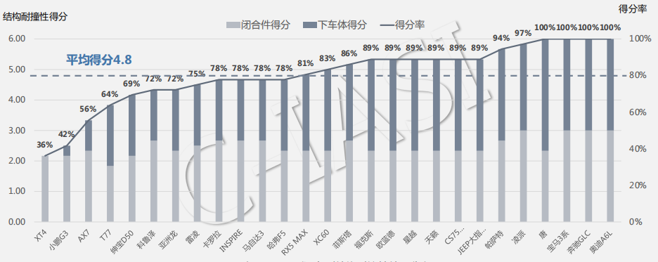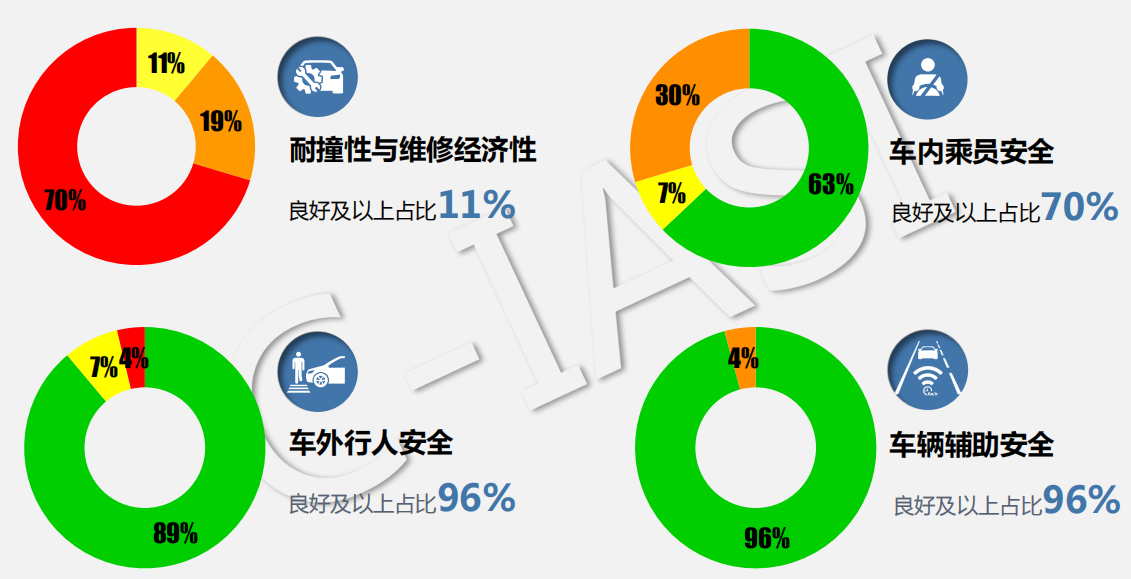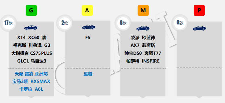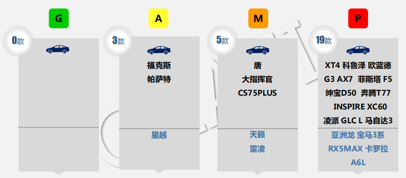 举个例子,正面25%偏置和侧面碰撞中,有4款车拿了差评,但在总体评价中,没有一款车是差评。