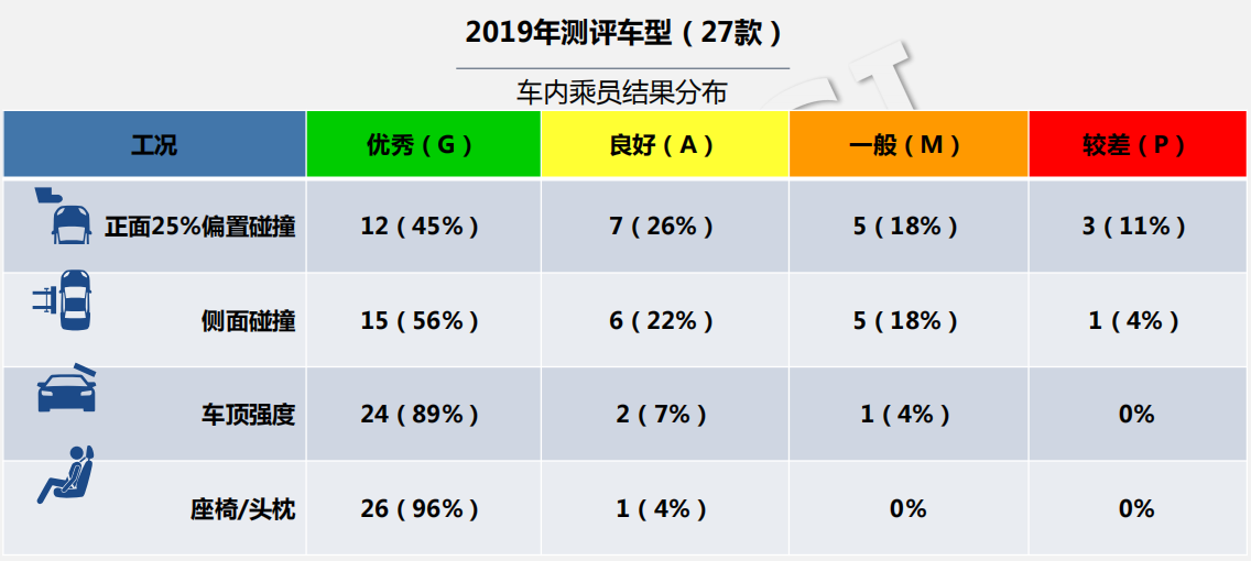 2019年,一共有17款车在车内乘客安全指数这一项目中拿到优秀评价。大多数人对这个测试的关注点集中在车身变形量,但你要知道良好与优秀评价之间可能只差一个安全气囊,因为最终评价看总分。