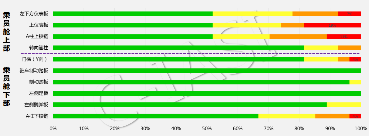 25%偏置碰撞中,A柱本身不纳入测量。真正测量的是A柱下方的铰链侵(又叫前立柱)、踏板、门槛、仪表盘等10个部位的侵入量。不少车栽在左下方仪表板(左脚膝盖处)、上仪表板和A柱铰链侵入量过大上,你看到的是A柱变形,但变形的起因可能与A柱连接的前立柱强度不过。