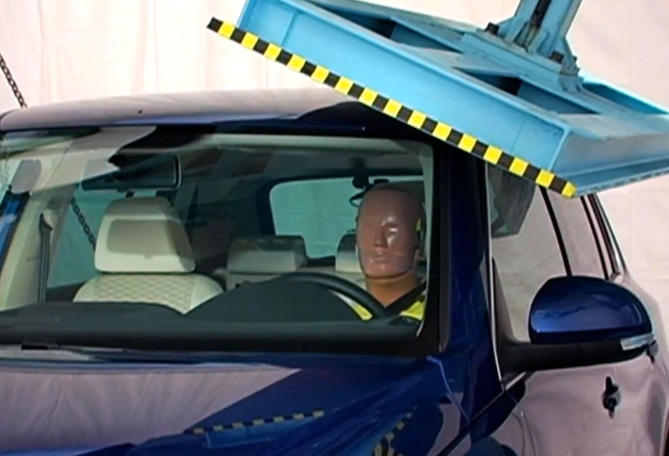 车顶强度测试的方法并不复杂,参考测试车重量给予车顶一定比例载荷,如果车顶所承受的载荷是重量的4倍,就属于优秀评价。如果没记错的话这个标准是国标要求的4倍,换句话说是辆车都能满足国标,现在知道为什么有些车国产后就减配吧,因为咱们国标实在是太宽松了!