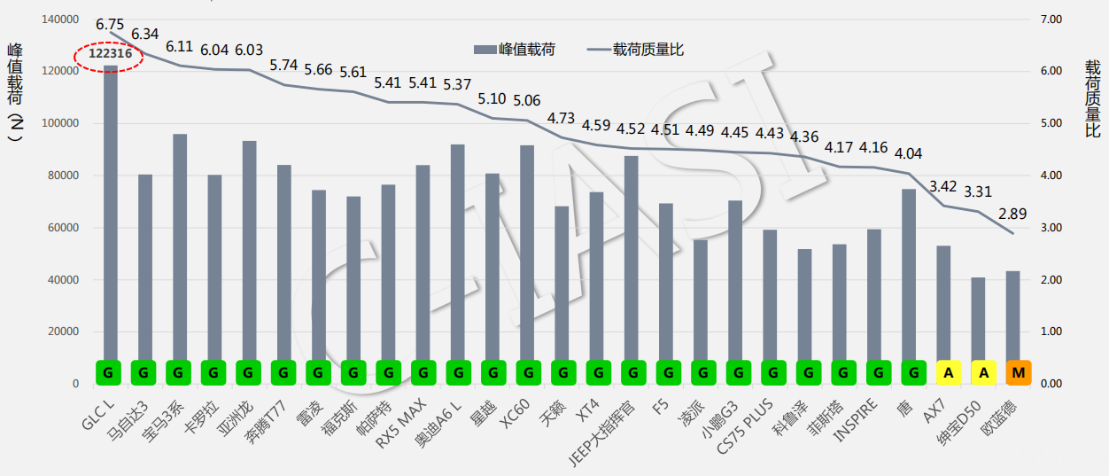 2019年所测试的车型中,奔驰GLC的车顶能承受的峰值载荷最高,达到了122316N,而GLC的整备质量为1850KG,那么载荷质量比就为6.75,可以这么理解,GLC车顶可以承受12.48吨的重量。马自达3载荷质量比为6.34,这是目前合资紧凑型轿车中最高的水平。奔腾T77为5.74,这是国产目前最高水平,虽然没有破6,但也好于很多合资车。