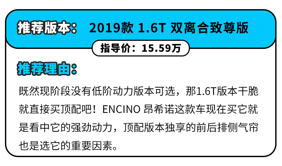 我个人的建议显而易见,就是希望北京现代能尽快为ENCINO 昂希诺加入低规格动力版本。当下北京现代旗下车型上1.5L自吸+CVT的动力总成就是很不错的选择,就算是更换为奕跑同款的1.4L自吸+6AT也不是不行,毕竟只要价格下来了,就算动力变弱,但ENCINO 昂希诺的颜值优势仍在,到时候肯定还有一大堆年轻人喊“真香”并买单的。