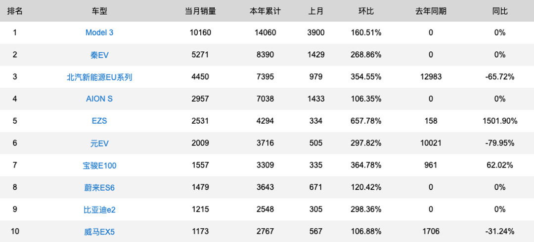 从这次新能源乘用车排行榜的具体车型排名可以看出,销量前10名大多被国内自主品牌旗下车型砍获。