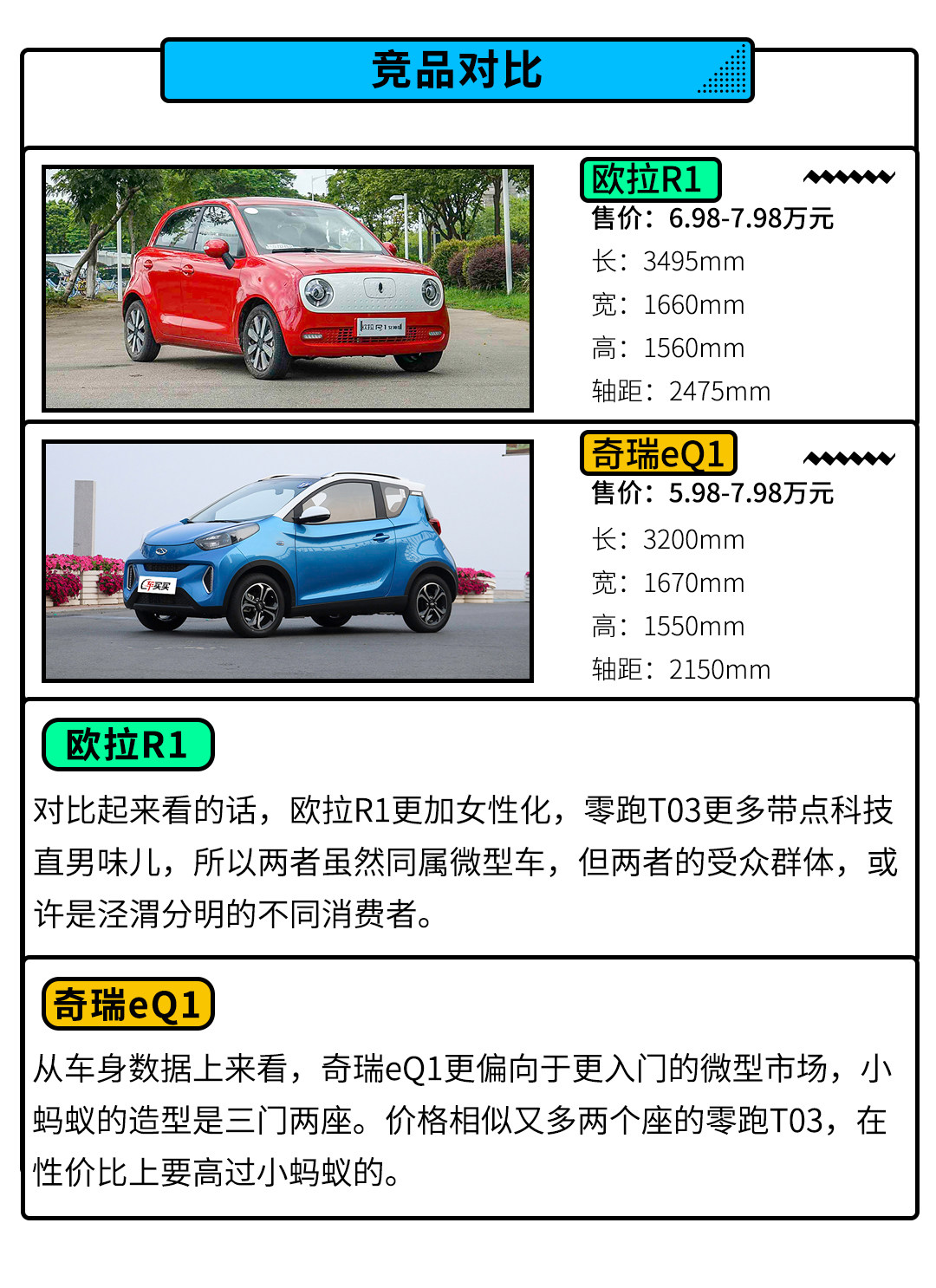 在与欧拉R1和奇瑞小蚂蚁的对比中可以看出,零跑T03的尺寸还是略占优势的。而在续航方面,零跑T03NEDC的403km续航,也足以笑傲群车,但客观地讲,续航的优势也并非到了碾压的地步。