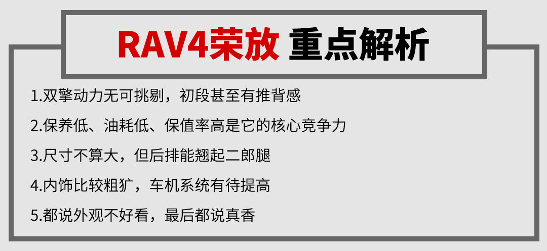 丰田还是原来的丰田,在造车上还是讲究全面以及均衡。RAV4荣放这款车虽然没有让人惊爆眼球的亮点,但各个方面加起来,铸造了人们该买的车型的样子。
