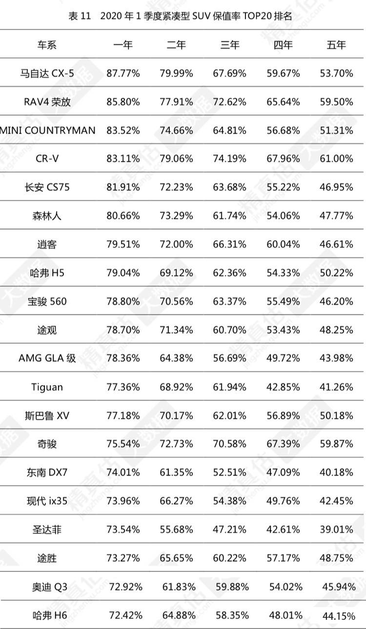 在SUV领域,价格更适中、产品表现更符合消费者用车诉求的紧凑型SUV占据了半壁江山,几乎每个品牌在这一细分市场都有几款主推车型,彼此间的市场竞争非常激烈,不管是合资还是自主车型,保值率都非常接近,有几分棋逢敌手的意思。