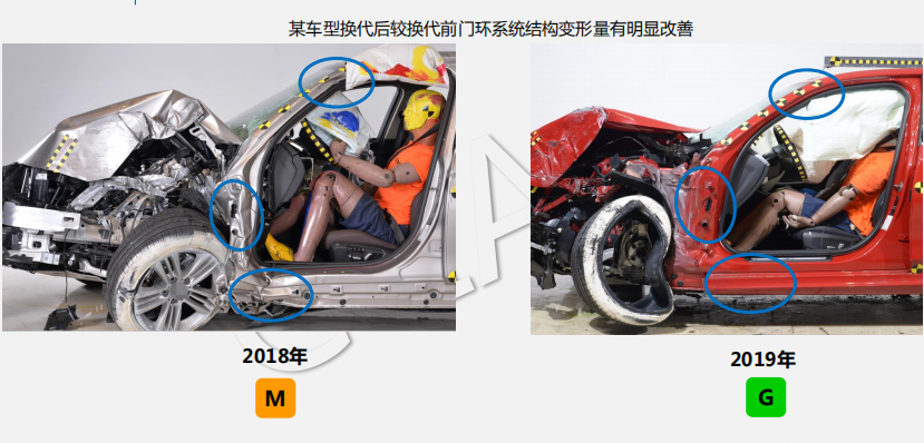中保研的一份研究报告指出,新款(换代)相比老款车身强度有明显提高,老款在小角度偏置碰撞中,前立柱、门槛、A柱变形量偏大,而这些问题在新款得以改进。