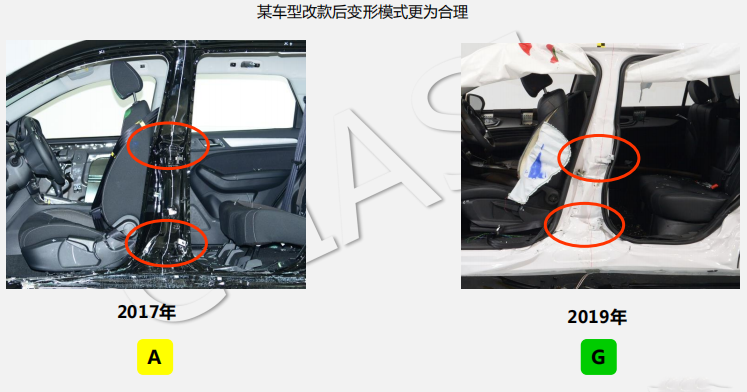另一个案例是改款,2019款相比2017款,虽然车身整体造型没有改变,但在侧面碰撞中,B柱的变形更加合理,可以看到2017款B柱上半段变形量大,2019款改进了这个问题,B的变形区域集中在下部。