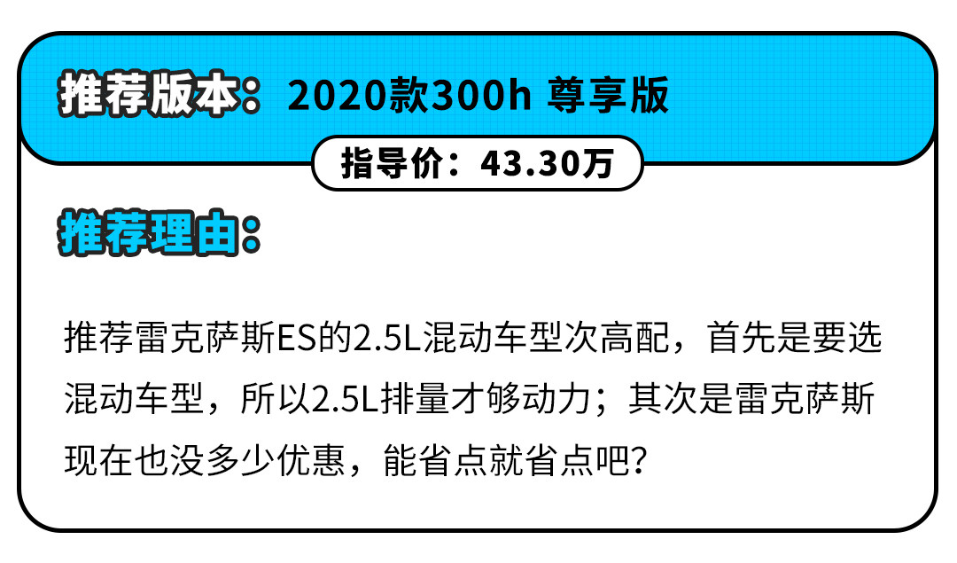 推荐车型为300h尊享版,人们常说混动才是雷克萨斯的灵魂嘛,所以买买君认为2.5L混动车型才更值得购买。而与最顶配车型相比,二者差别也仅在电动感应后备厢、悬架软硬调节、后排控制多媒体等,而顶配版要多掏5万块,买买君觉得并不值得。