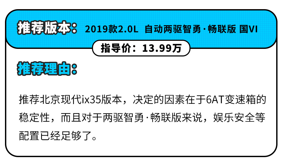 现代ix35车型推荐版本为自动两驱智勇·畅联版,主要在于1.6L动力不久更足,而且与之搭配的是稳定的6AT变速箱,比之1.4T+7挡双离合更值得依赖。从配置上来看,自动两驱智勇·畅联版不到14万的价格,就能拥有胎压显示、电动天窗、9.6英寸中控屏等必需配置,是性价比最高的一个选择。