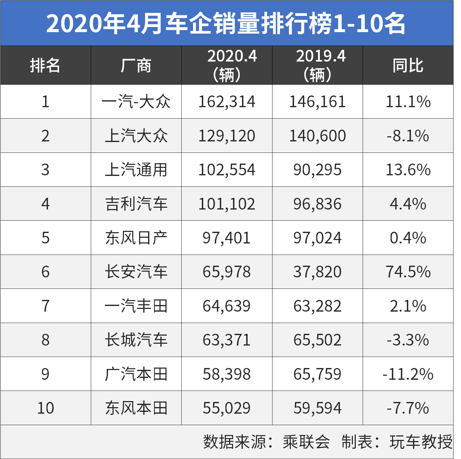 另外从车企方面来看,4月份有多家车企慢慢恢复正常。一汽-大众、上汽大众依然是国内消费者最受欢迎的车企,稳座前两把销量交椅。与去年同期相比,一汽-大众还有11.1%的涨幅,4月份销量达到126,324辆,实属不易。而上汽通用在4月份强势追击飞跃到第三名,这有赖于新车的不断推出,提升了车型的综合竞争力,以及提供的一系列购车惠民政策。