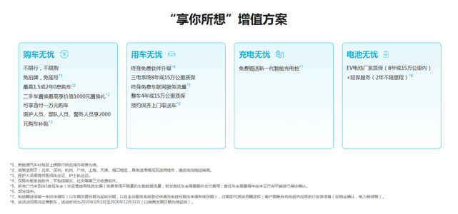 此外,由于现在还是处于疫情期间,厂家对于现在购车的用户,提供电池10年不限公里的质保,以及车辆终生免费保养的政策福利。 同时,自购车之日起一年时间内,可以赠送一个包含30米缆线的充电桩到你指定的位置,免除电动车充电的烦恼。