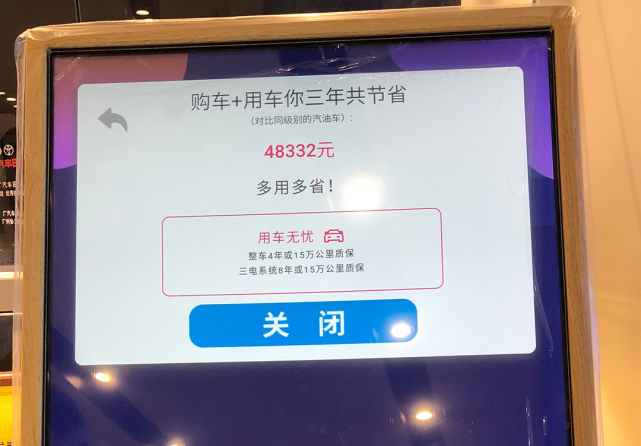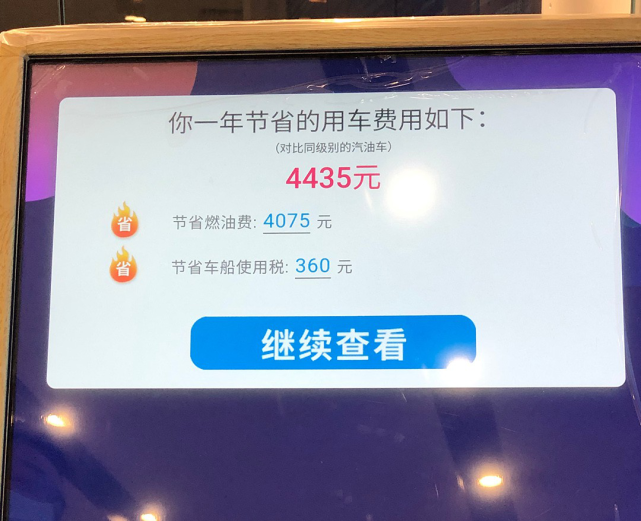 与此同时,销售马上给我算了一个账,作为一款新能源车型,以每天要走50km的路程为例,一年能省下4000块的油钱以及360块的车船税,如果多走的话省的还会更多。