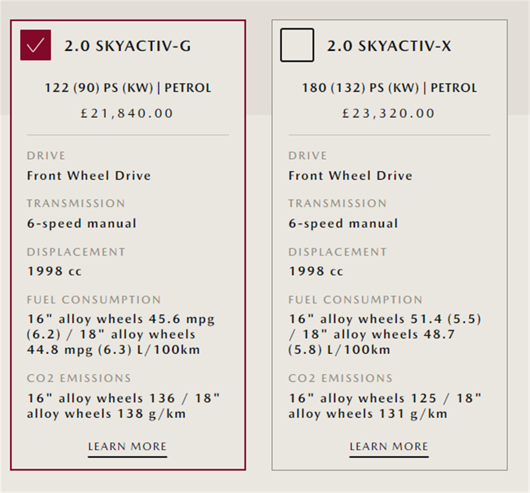 不过看到这些棒极的参数,想大叫“买爆”之前,买买君还是得小泼一杯冷水。上图是英国马自达官网上的马3报价。可以看到入门版的2.0L普通发动机马3售价为21840英镑,隔壁的2.0L压燃版马3售价为23320英镑。也就是说压燃版比普通版的售价贵了1520英镑【约合13280元人民币】。