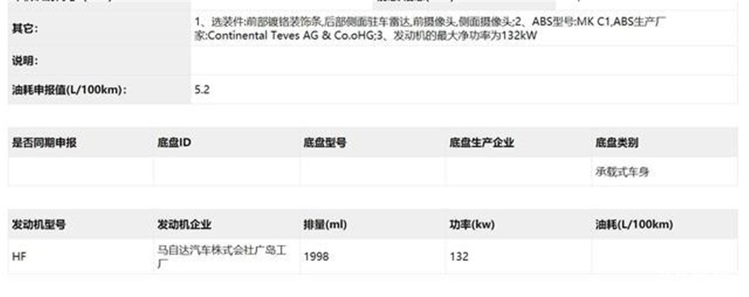 申报名单中的这台搭载着2.0L压燃发动机的马3,最大功率为179Ps,峰值扭矩为224N•m,申报的工信部油耗为5.2L/100km。需要注意的是,它的两项动力参数数值都比现款在售的2.0L马3高出了20多,但是工信部油耗却比现款2.0L马3的5.8L/100km更低;即便工信部油耗的参考价值更大,但在统一标准下,动力更强、油耗更低的压燃版马3还是展现出了压燃发动机的黑科技。