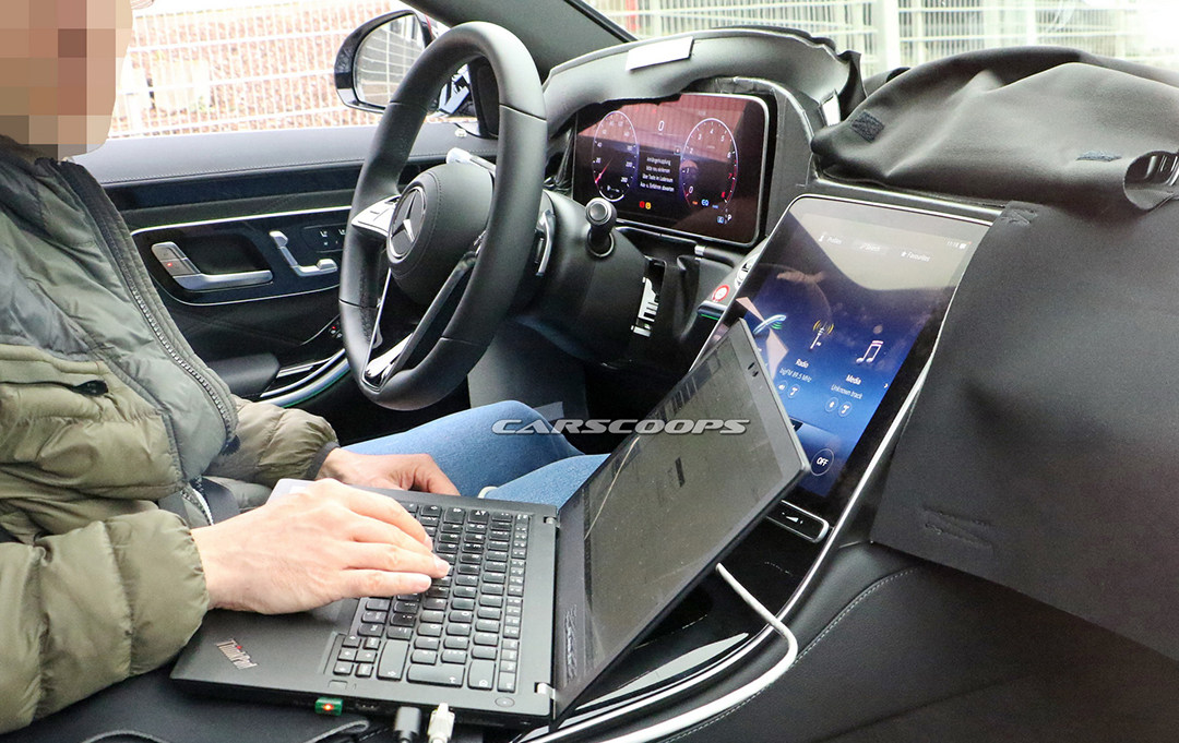 除外观设计之外,新车的内饰设计也几乎被完全曝光;根据此前外媒拍摄的谍照,新一代S级在内饰部分将会采用两块尺寸惊人的液晶屏,并且改变现有车型标志性的一体化屏幕设计。在此次曝光的内饰图片中,可以看到新车液晶仪表与现款A级一样没有配备遮光边框,而中控大屏则倾斜着悬浮于中控台上方;而环抱式中控台面板全部采用黑色烤漆部件,现款车型经典的圆形空调出风口也被更换为细长的圆角矩形样式,让整个中控区域显得非常简洁。