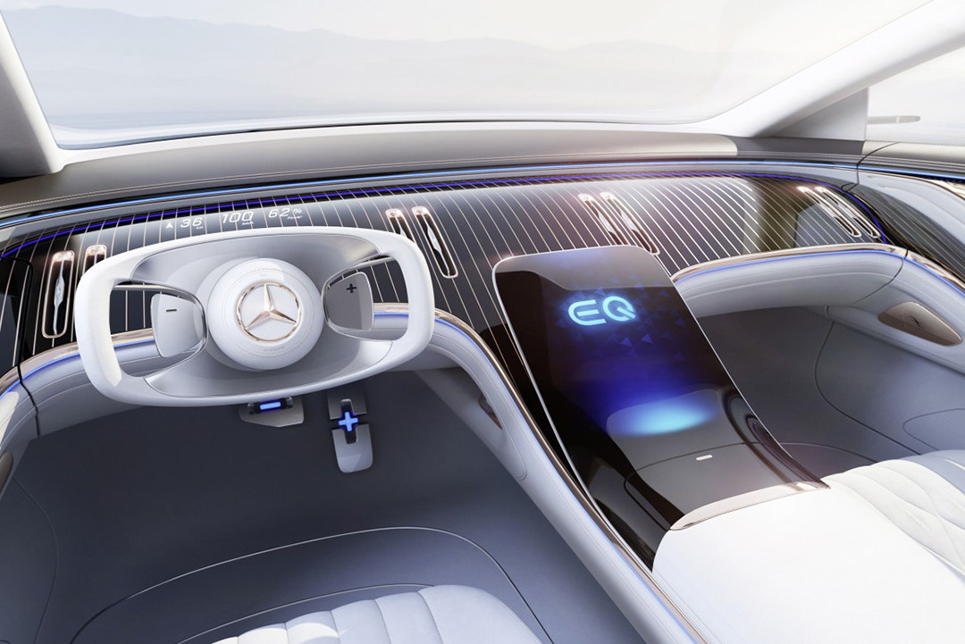 这样的中控台造型使教授想起去年奔驰发布的Vision EQS概念车,这款概念车的内饰部分同意采用了这种“游艇感”强烈的环抱式中控造型,其中控液晶屏布置方式也与新一代S级高度相似。
