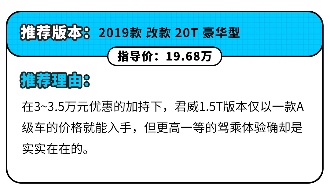 不可否认,2.0T发动机给君威提供了更强的驾驶乐趣和加速体验,但1.5T更适中的动力表现和较低的售价明显更适合一般以家庭用车为需求的消费者,最关键的是辅以不错的市场优惠,君威1.5T豪华型的指导价为19.68万,但折合目前3~3.5万的终端现金优惠,裸车价仅16.18万,算上税费和保险等,落地价不足19万。这也是君威目前市场销量稳居B级车市场高位的主要原因。