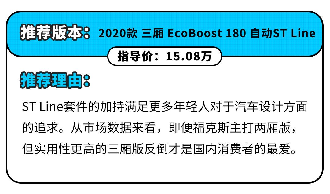 福克斯在欧洲市场属于一款人气很高的两厢小钢炮,但为了应对国内消费者不同的审美和用车需求,福克斯在中国市场提供了两厢版和三厢版的车型选择。不过好在相同版本的两厢版和三厢版车型在动力和配置分布基本保持一致的水准。在现款在售的福克斯车型中,大多数消费者还是钟情于选择带ST Line运动套件的版本,但两厢还是三厢车型则需要消费者根据自身喜好进行选择了。
