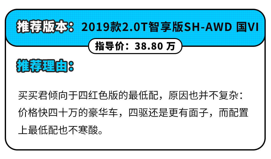 买买君推荐的车型是两驱梦想版,也就是两驱版里的次高配。主要是因为在城市驾驶中,四驱的用武之地不多,所以选择两驱版更划算。相比高配版本,梦想版只是少了自适应巡航和360度全景影像,而实际上梦想版还可以选装360度全景影像,所以就没有太大必要加钱上顶配了。