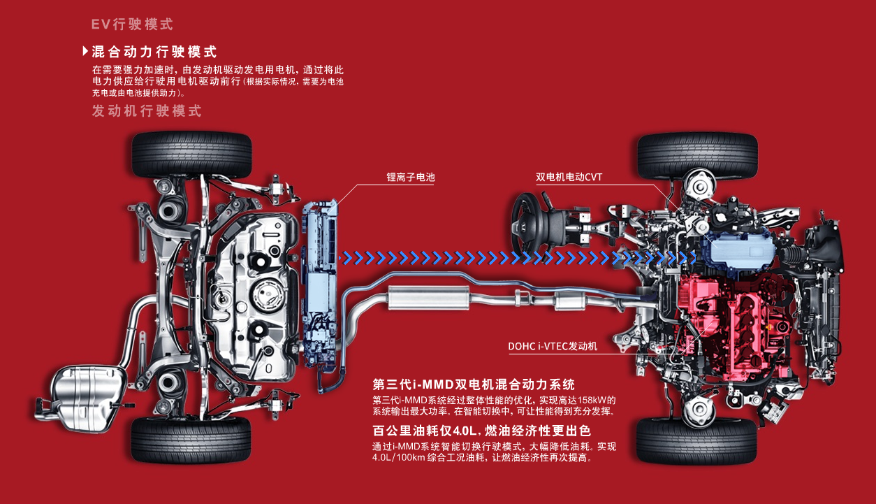 从第九代雅阁开始搭载的i-MMD混合动力系统经历了不断的更新和优化,在现款雅阁锐·混动上的表现可谓十分讨喜。现款雅阁锐·混动版搭载本田第三代i-MMD双电机混合动力系统由2.0L阿特金森循环发动机+双电机+锂离子电池等组成,有纯电、混动和发动机直接驱动共三种模式,综合最大功率158kW。